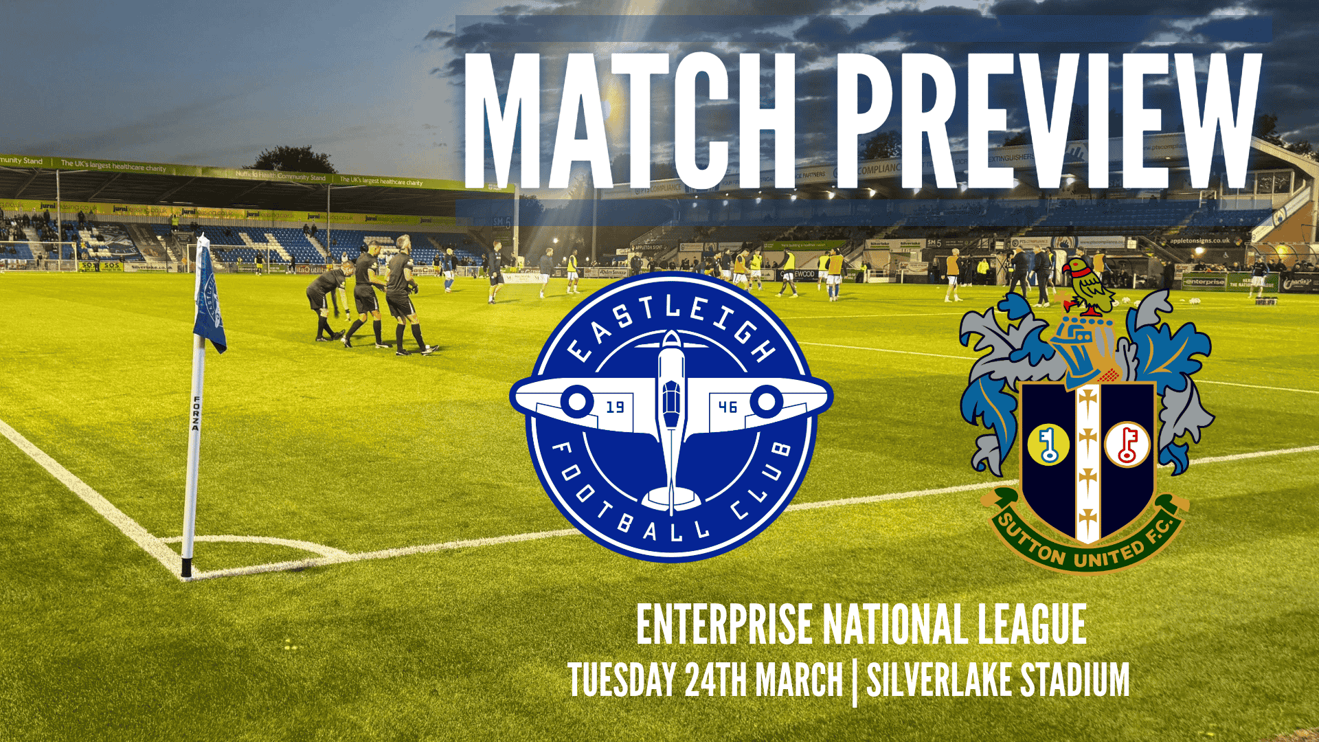Eastleigh and Sutton United logos with Silverlake Stadium under floodlights