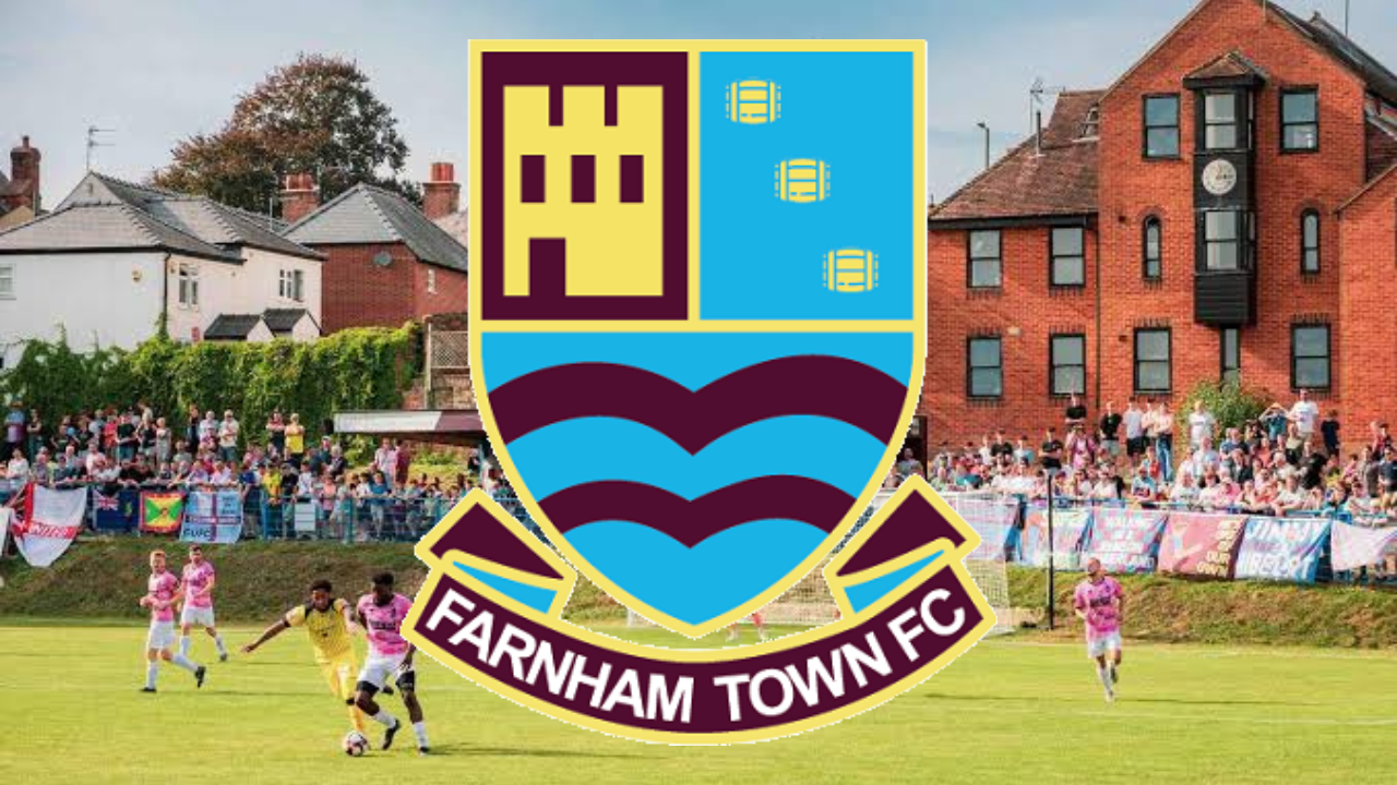 The badge of Farnham Town with the background of their stadium