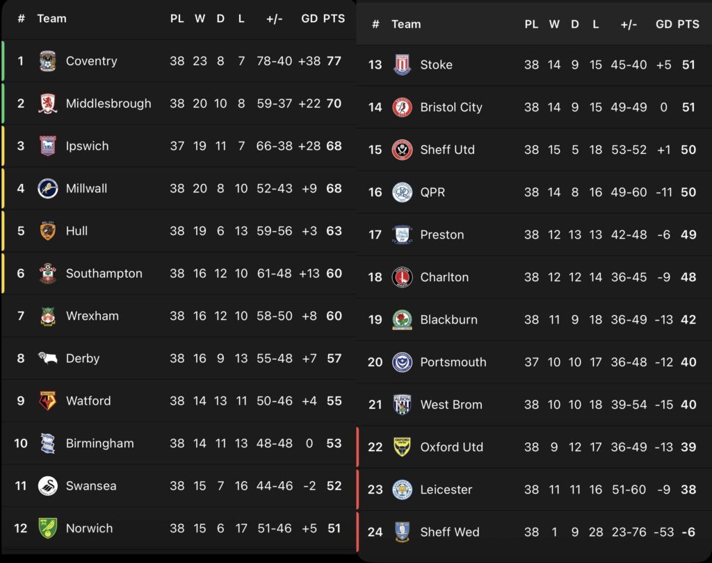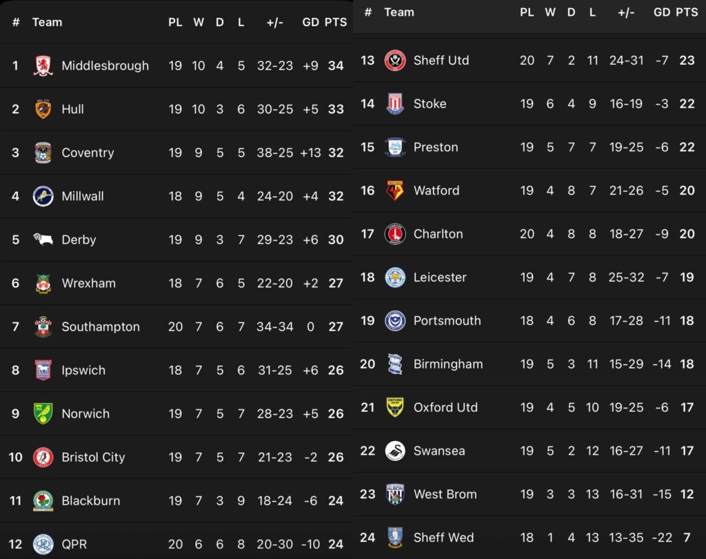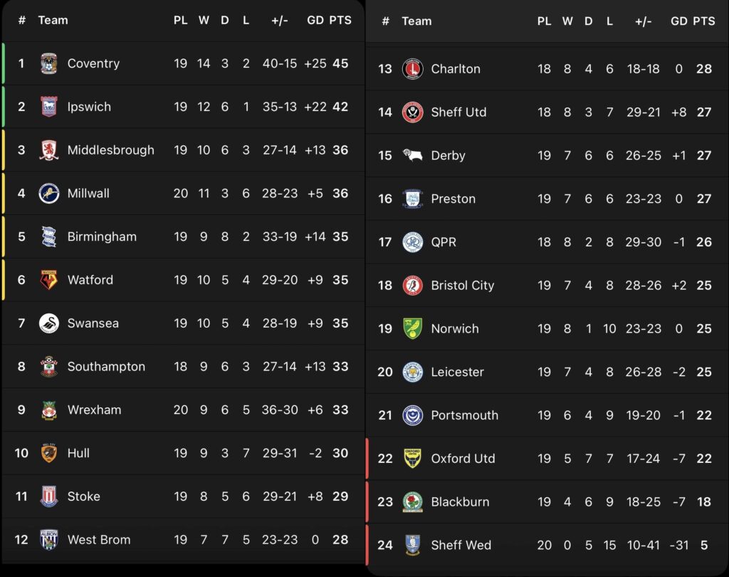 Here we can see the EFL Championship table based on results at home for every team and there is no change at the top with Coventry or the bottom with Sheffield Wednesday, who haven’t won at home all season to this point.