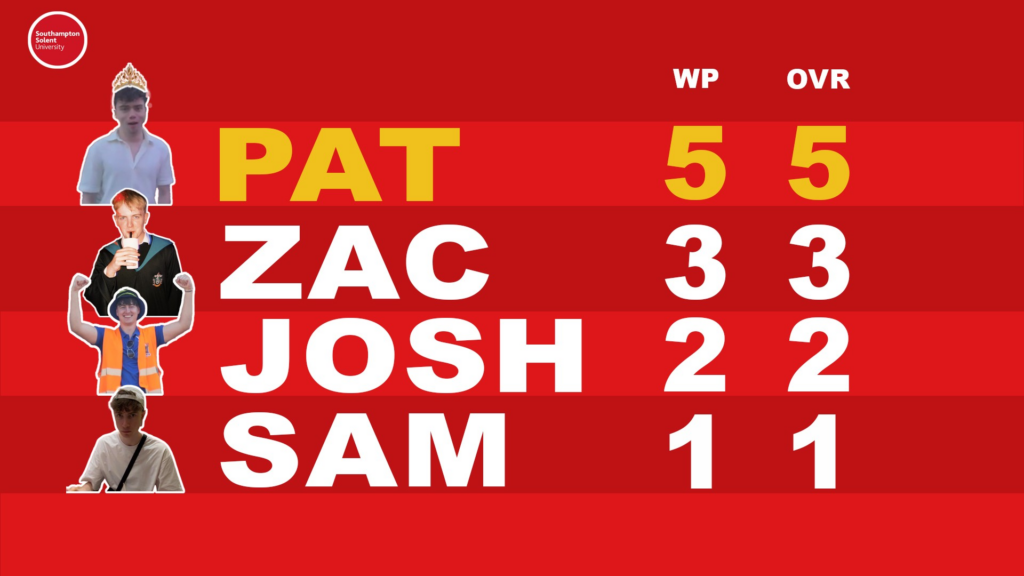 We were ranked on our kicking technique and Week 1’s table is below.