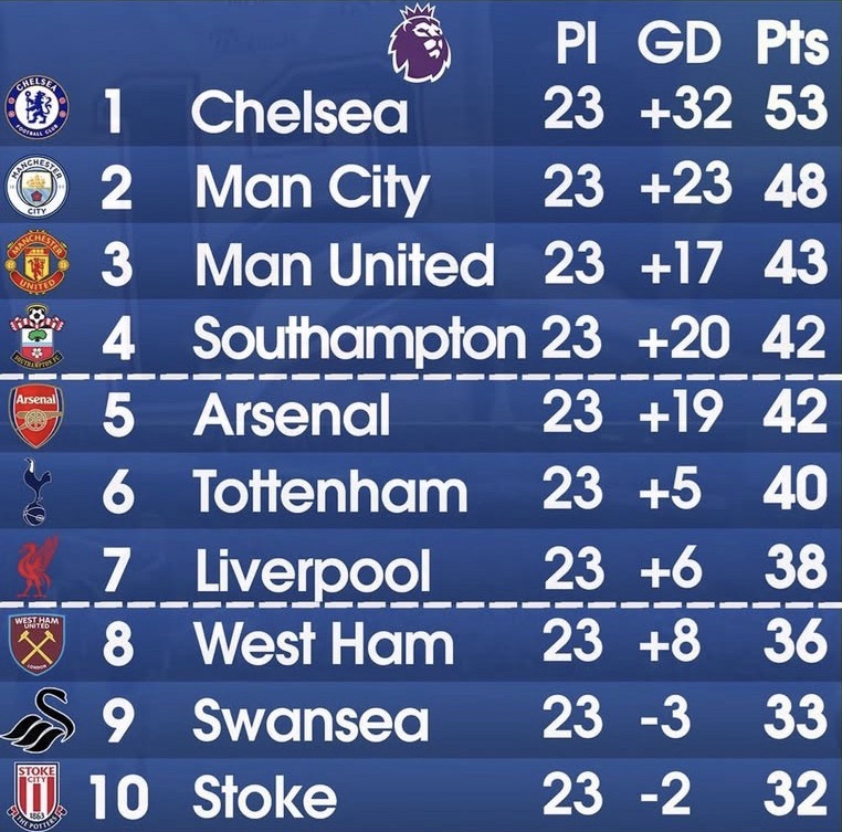Jose Mourinho’s Chelsea were top of the table on 53 points, and ended the season as champions with 87. This season they’re now managed by Liam Rosenior – after waving goodbye to the likes of Tuchel, Lampard and Maresca – and sit fifth in the Premier League on 40 points, one off Man United.