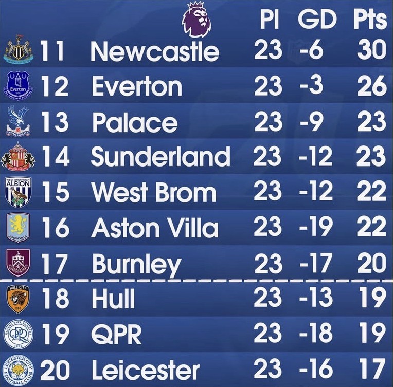 Villa sat 16th on 22 points, and finished the season in 17th, surviving the drop by three points. Villa actually made the FA Cup final this year, but lost the second most games this season, QPR the only side with more, but crucially claimed more victories than their relegation rivals.