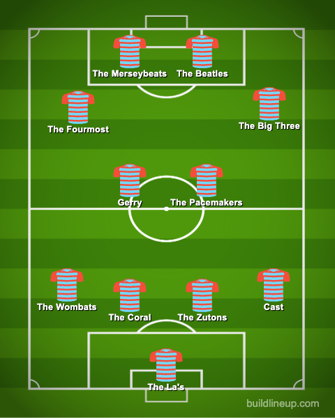 An attacking lineup, the two big names up front (Alexander Isak + Hugo Ekitike style), with two wingers who are full of energy. Gerry and the Pacemakers are at the heart of the team, linking to their classic anthem, You’ll Never Walk Alone.