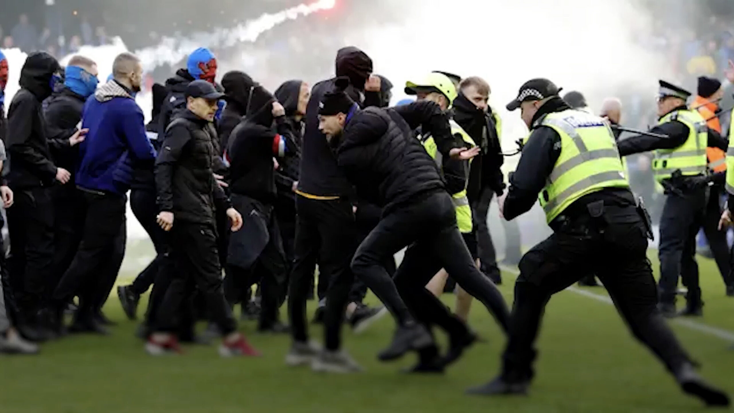 The scenes, which saw hundreds of fans from both clubs invade the pitch, have drawn widespread condemnation and sparked calls for a potential ban on away supporters.