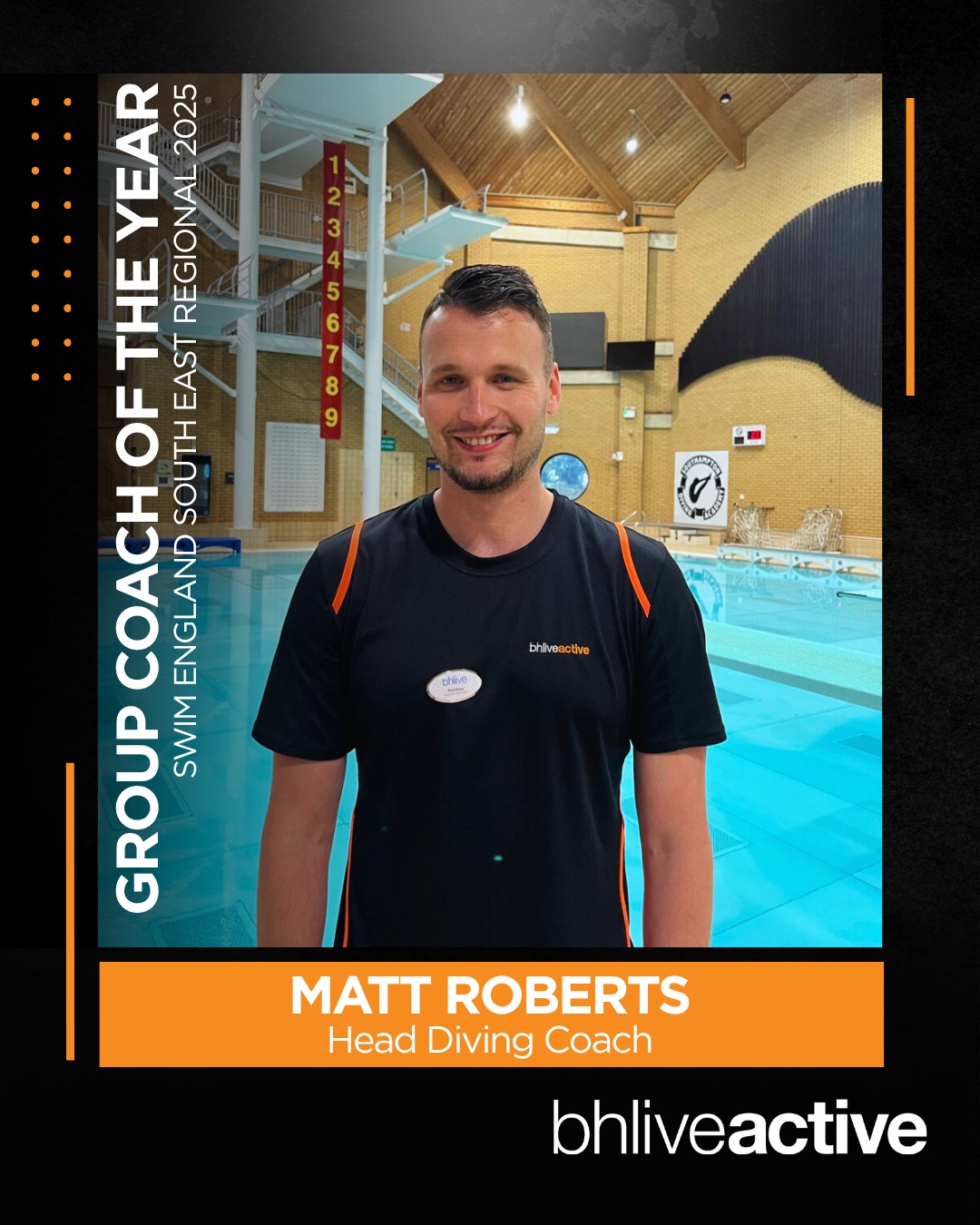 MATTHEW ROBERTS, Head Diving Coach at BH Live Active, The Quays in Southampton, has been awarded the Children/Age Group Coach of the Year at Swim England’s South East Regional Awards.